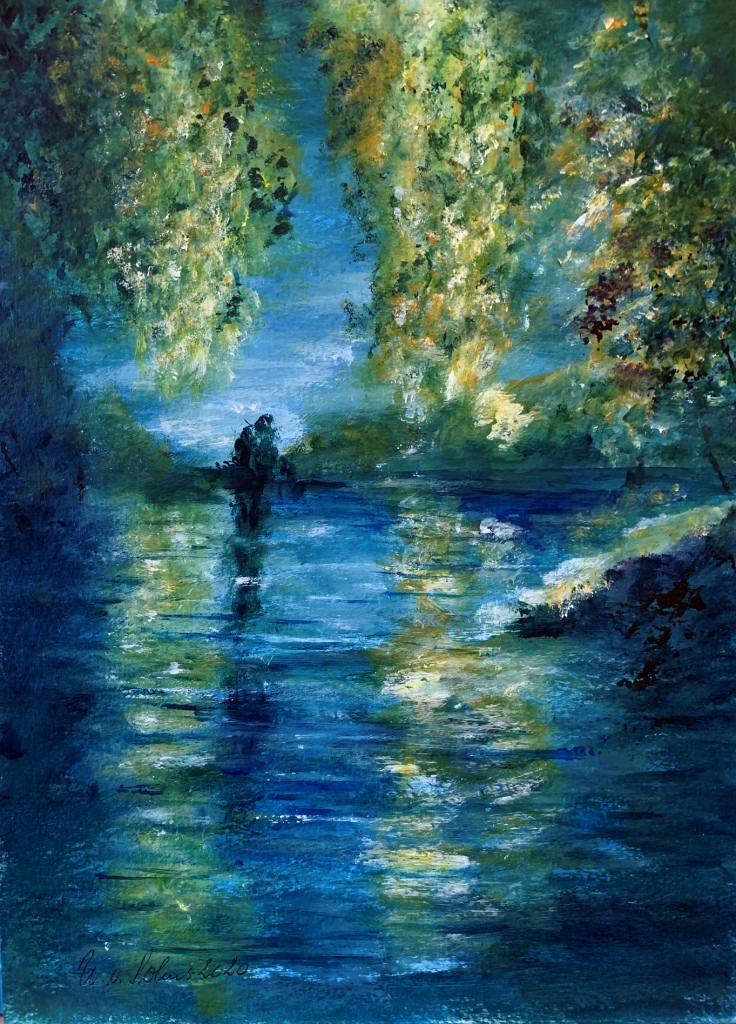 Das Bild ist auf starkem Papier mit Acrylfarben gemalt. Durch ein entsprechendes Passepartout und dem Rahmen lässt sich die Größe des Bildes variieren.