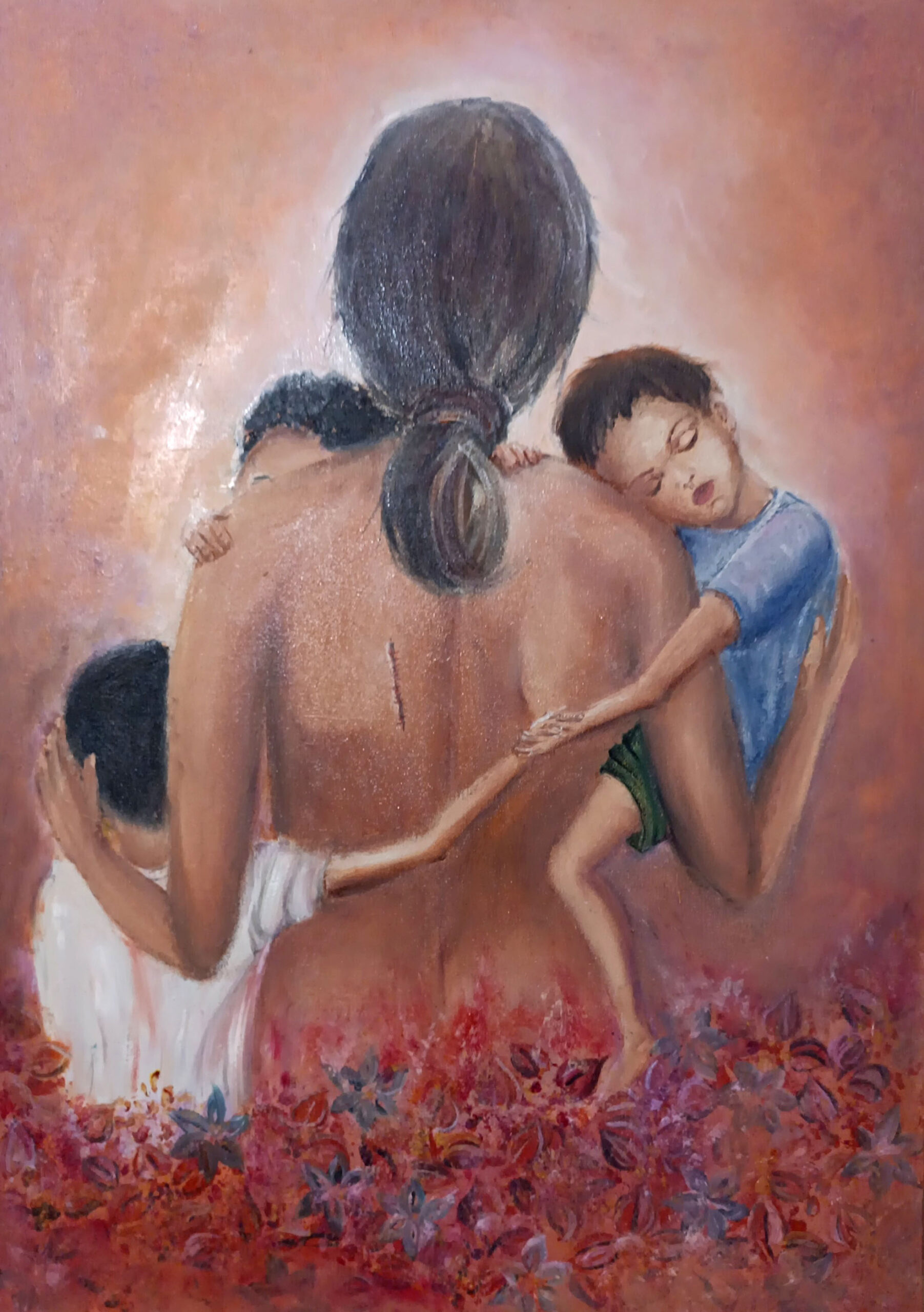Carrying the World portrays a quiet yet powerful moment of protection and devotion. Seen from behind, the central figure becomes an archetype rather than an individual — a bearer of life, memory, and responsibility. The children resting against her body are not merely figures, but extensions of trust, vulnerability, and unconditional belonging. The exposed back, marked by a subtle scar, speaks of endurance and lived experience. Strength here is not heroic or loud; it is intimate, worn, and deeply human. The warm, earthy palette and the floral ground suggest both fragility and continuity — life carried forward despite weight, fatigue, and sacrifice. This painting reflects the unseen labor of love: the act of holding others together while remaining almost invisible oneself. It is a meditation on care, resilience, and the silent courage required to carry the world for those who cannot yet carry it themselves.