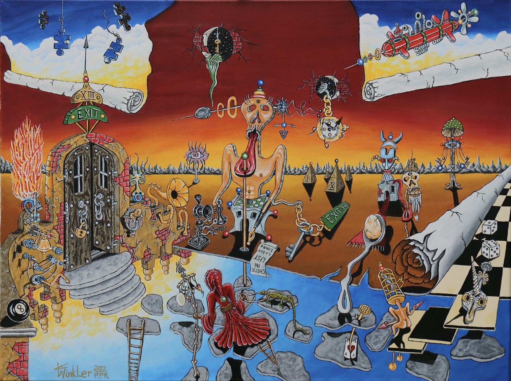 “Der Rezeptionist vom Exit 13” Ein einzigartiges, signiertes Unikat das in metaphysisch-surrealen Zügen die Grenzen zwischen den Welten auslotet. “Der Rezeptionist vom Exit 13” erscheint als mystischer Pförtner, der den Übergang ins Jenseits oder eine andere Dimension bewacht. Die vielschichtige Landschaft des Bildes erzählt von der unabwendbaren Vergänglichkeit des Lebens und des Seins, Schicht für Schicht löst sich eine Realität auf. Doch aus dieser Auflösung entsteht die Verheißung ewiger Erneuerung. Das Werk ist ein visuelles Rätsel, ein kryptisch symbolisierter, mehrdimensionaler Kreislauf. Es fordert den Betrachter heraus: Nur wer sich auf die verwirrende Komplexität und die zahlreichen Ein- und Ausgänge einlässt, wird die tiefere, verborgene Symbolik des Künstlers erahnen und entschlüsseln können. Zu jedem Werk bekommt der Käufer ein vom Künstler gestaltetes und persönlich handschriftlich unterfertigtes, “Atelier-Zertifikat”.
